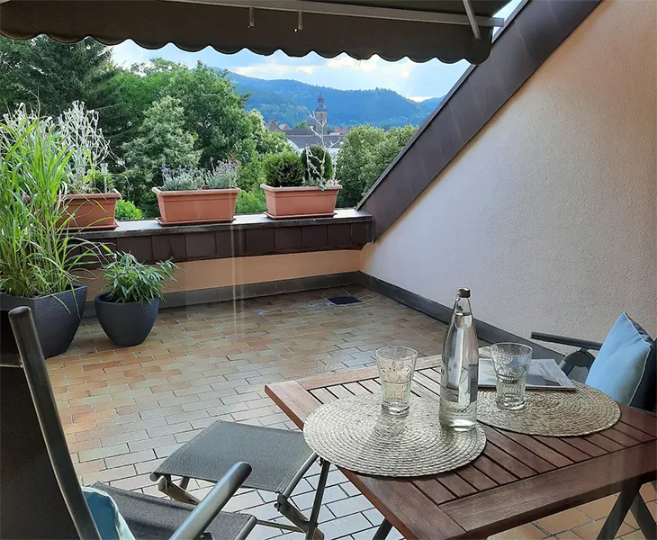 Von der großen, nach Südwesten ausgerichteten Dachterrasse haben Sie einen schönen Blick auf das Städtchen und den umliegenden Pfälzer Wald.